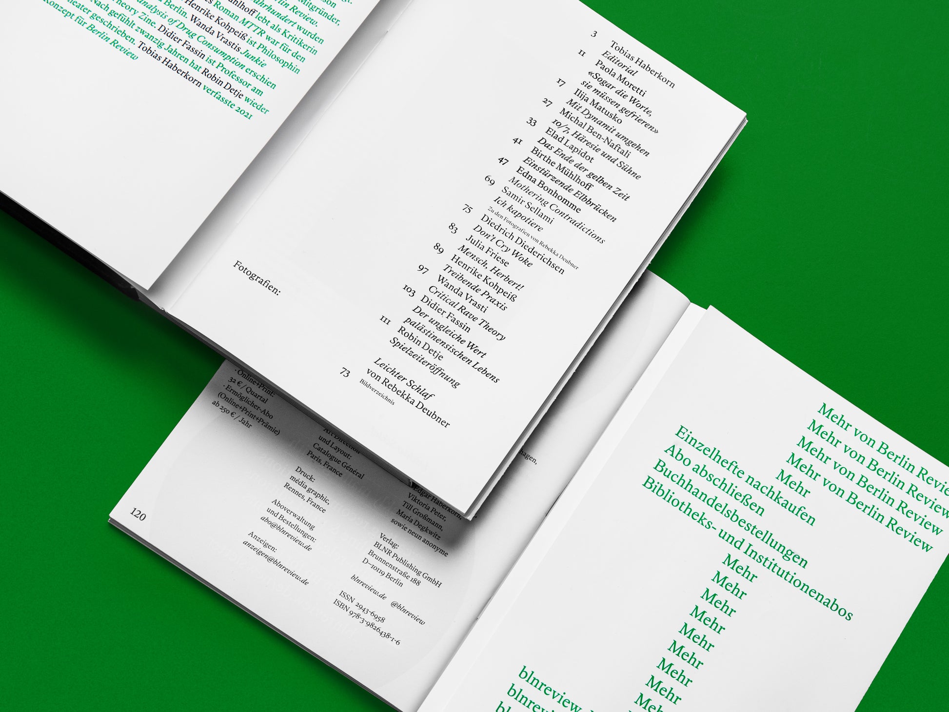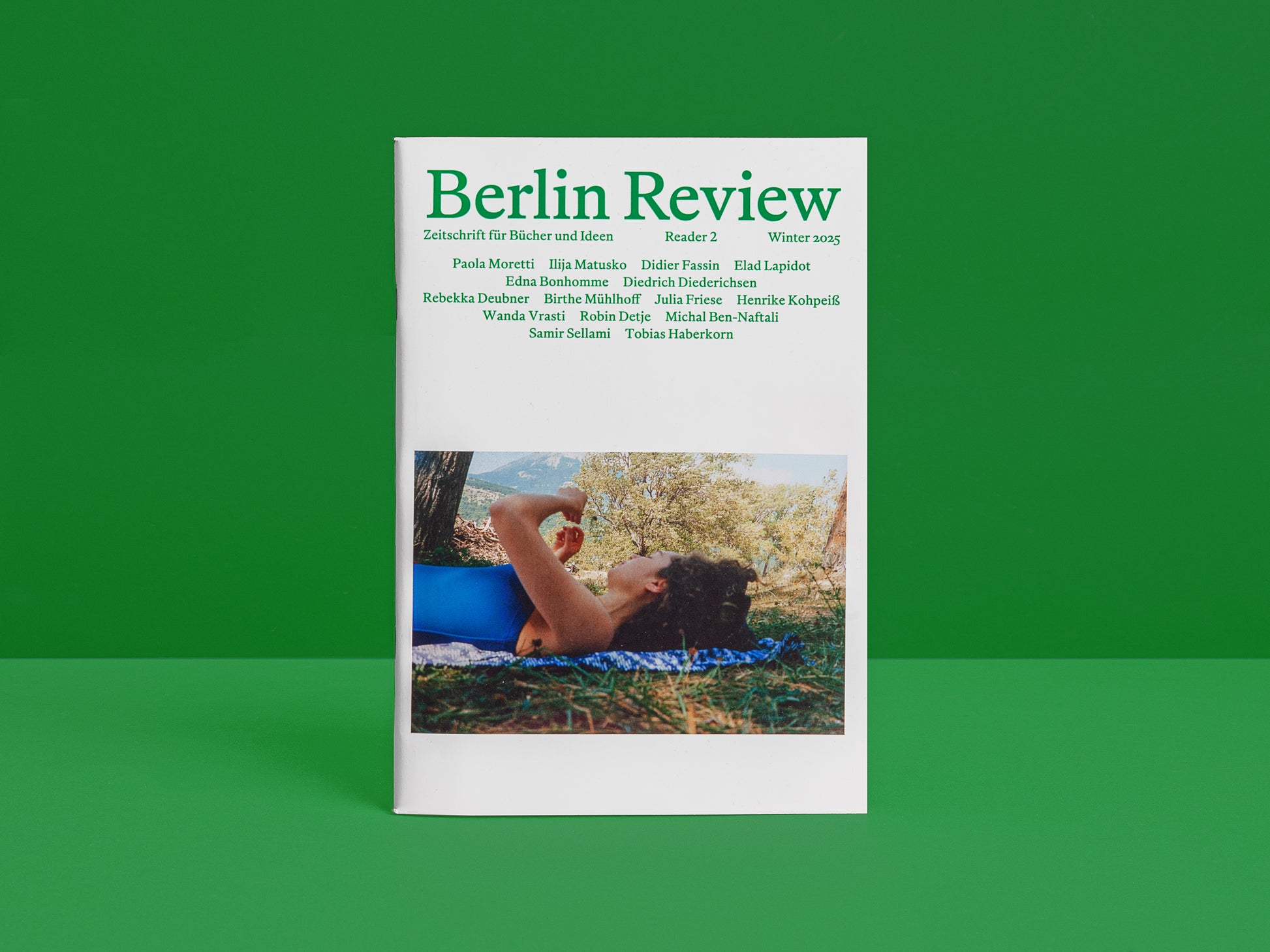 Die zweite Printausgabe der Berlin Review. Texte über Bücher, Ideen und die Gegenwart von Paola Moretti, Ilija Matusko, Didier Fassin, Elad Lapidot, Edna Bonhomme, Diedrich Diederichsen, Birthe Mühlhoff, Julia Friese, Henrike Kohpeiß, Wanda Vrasti, Robin Detje, Michal Ben-Naftali, Samir Sellami und Tobias Haberkorn. Mit Fotografien von Rebekka Deubner und Übersetzungen von André Hansen.