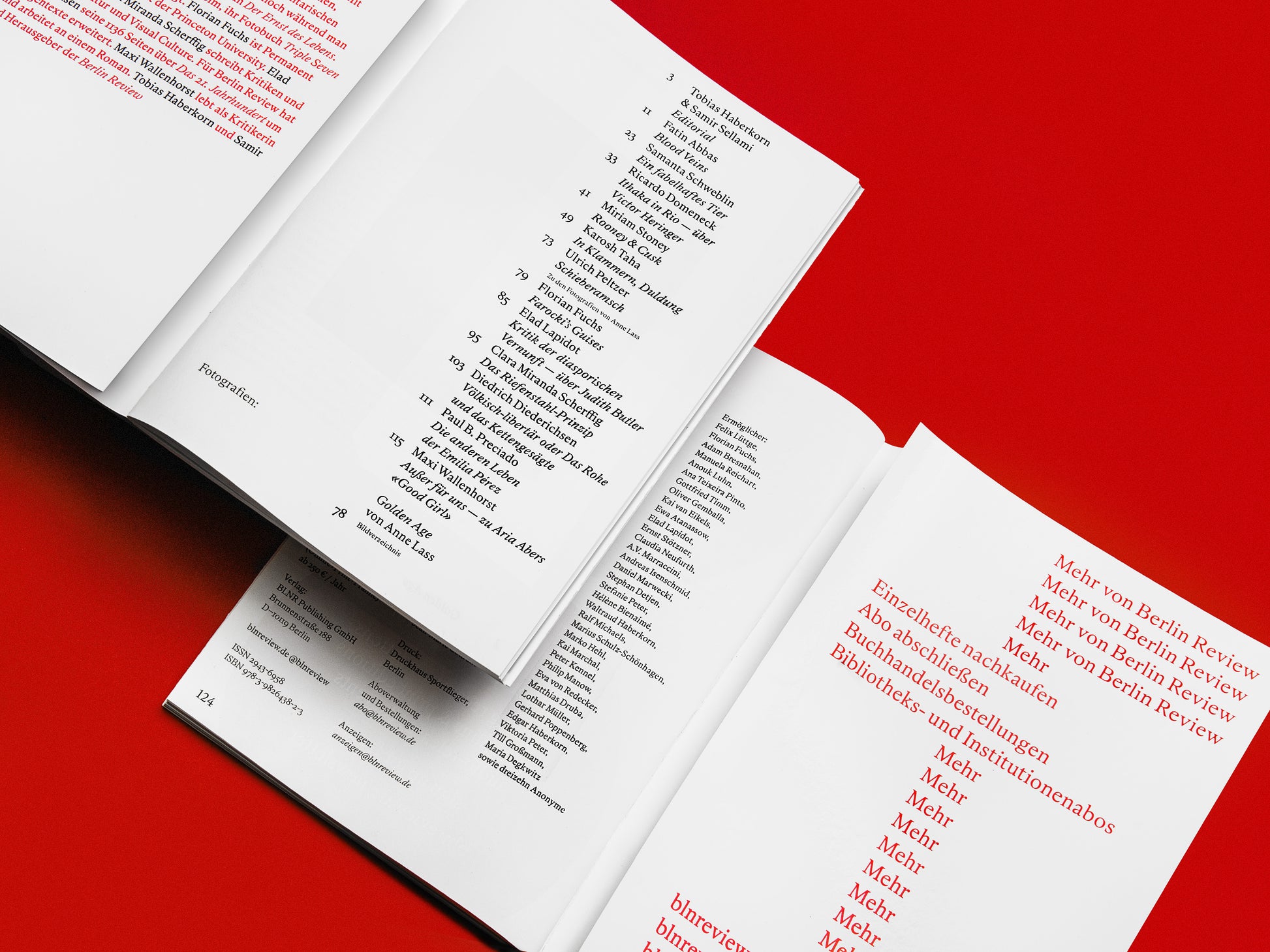 Die dritte Printausgabe der Berlin Review. Texte über Bücher, Ideen und die Gegenwart von Fatin Abbas, Samanta Schweblin, Ricardo Domeneck, Miriam Stoney, Karosh Taha, Ulrich Peltzer, Florian Fuchs, Elad Lapidot, Clara Miranda Scherffig, Diedrich Diederichsen, Paul B. Preciado, Maxi Wallenhorst, Samir Sellami und Tobias Haberkorn. Mit Fotografien von Anne Lass.
