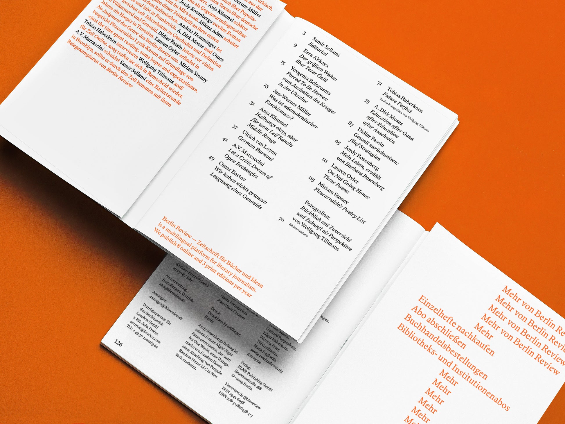 Der fünfte Reader der Berlin Review erscheint am 22. November 2025. Fotos von Wolfgang Tillmans; Texte von Jan-Werner Müller, Yevgenia Belorusets, Omer Bartov, Anja Kümmel, A. Dirk Moses, Ulrich van Loyen, Esra Akkaya, Didier Fassin, Tobias Haberkorn, A.V. Marracini, Jordy Rosenberg, Miriam Stoney, Lauren Oyler. Um alle Reader direkt bei Erscheinen geliefert zu bekommen, einfach ein Online+Print-Abo abschließen!